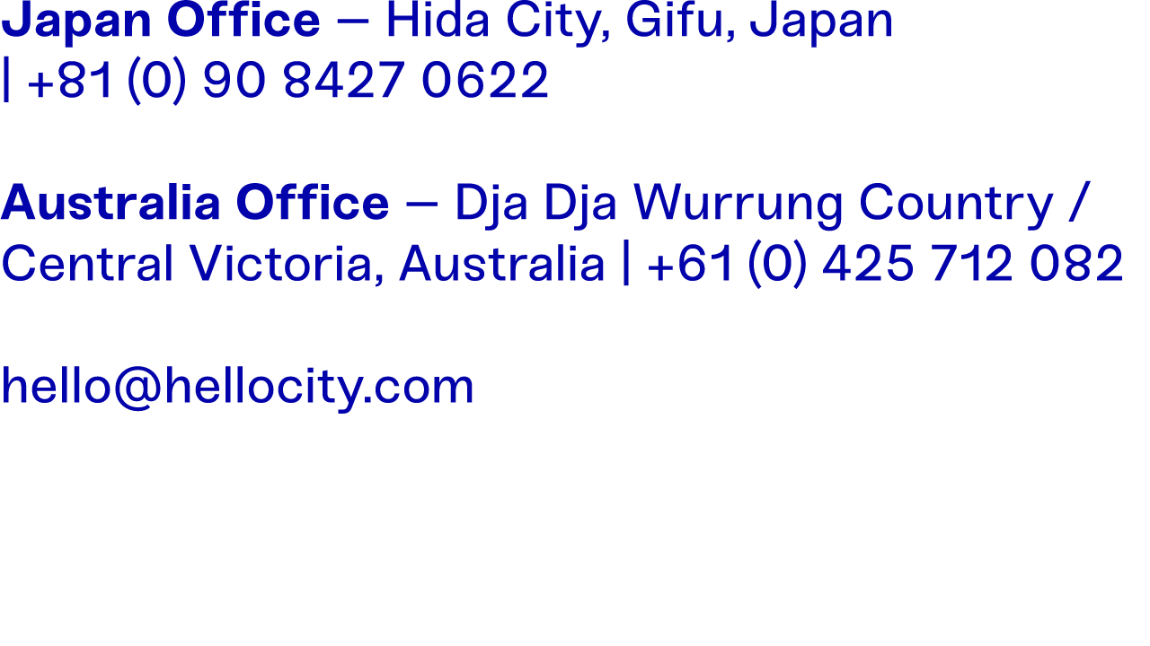 Hello City is a collective of urban strategists based in Japan & Australia. Our core team expands & partners with other organisations when needed to address specific challenges & project needs.